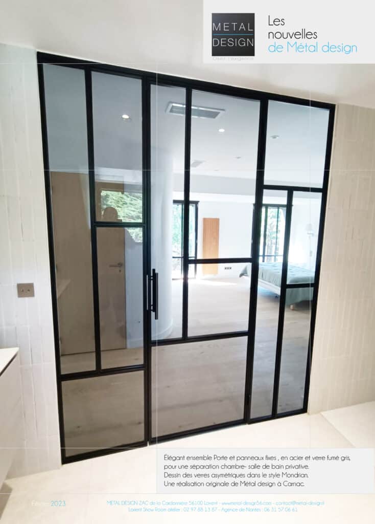 Élégant ensemble Porte et panneaux fixes, en acier verre fumé gris, pour une séparation chambre – salle de bain privative. Dessin des verres asymétriques dans le style Mondrian. Une réalisation originale de métal Design à Carnac.